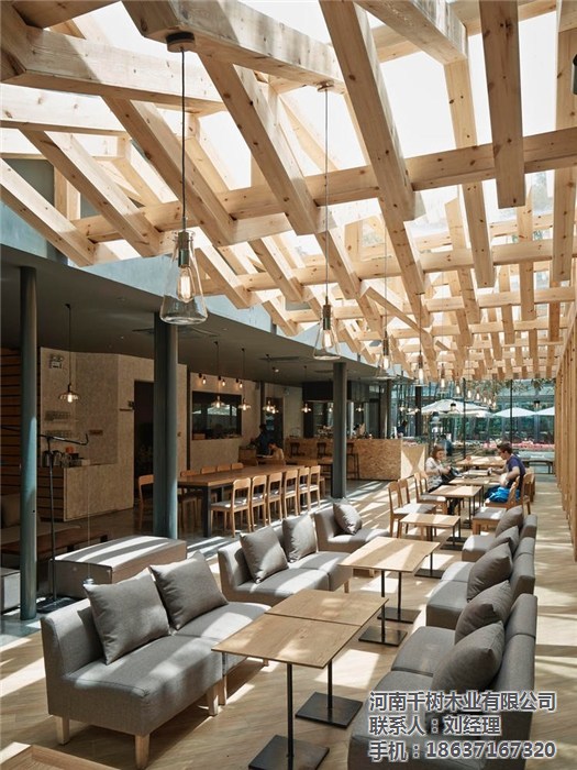 且新增的木梁在原有的鋼梁結(jié)構(gòu)之間交織穿梭,形成豐富有層次的光影效果,尤其是在天氣晴好的時候,體驗感更為直接。對于空間區(qū)域的分割,設(shè)計團隊也著手從天花板部分來創(chuàng)造。比如前述提到的主要的編織木梁結(jié)構(gòu),其下方的空間寬敞明亮,更適合于那些喜愛沐浴在陽光或自然天光之下的客人們。而靠近建筑內(nèi)部的空間,在灰黑色的天花板映襯之下,則要顯得沉穩(wěn)、私密一些,顯然更適合那些需要安靜空間的客人們。