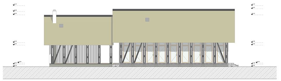 被強(qiáng)化的建筑結(jié)構(gòu)進(jìn)一步實(shí)現(xiàn)了度假屋的設(shè)計(jì)理念。以1.4米間隔成對(duì)出現(xiàn)的結(jié)構(gòu)柱式形成了建筑的主立面。玻璃門(mén)窗沿立面鋪設(shè),賦予了陽(yáng)光足量的穿行空間,讓人的生活與自然環(huán)境充分接觸。