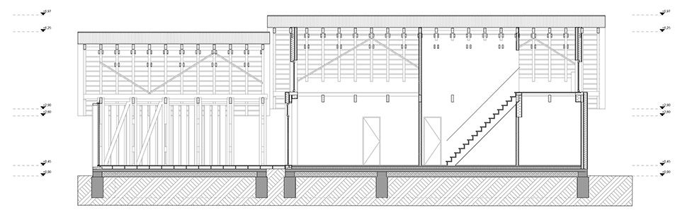 該建筑的形態(tài)設(shè)計(jì)和材料選擇均充分尊重了場(chǎng)地的周?chē)h(huán)境。設(shè)計(jì)師將傳統(tǒng)材料運(yùn)用與當(dāng)代設(shè)計(jì)手法之中,裸露可見(jiàn)的承重結(jié)構(gòu)形成富有韻律感的外立面,讓建筑彰顯與眾不同之處。