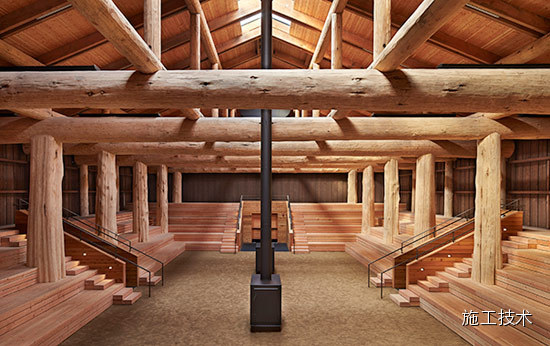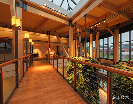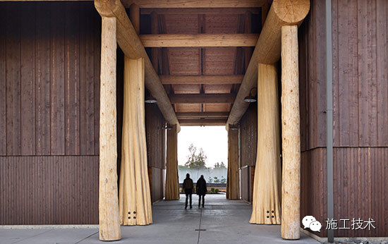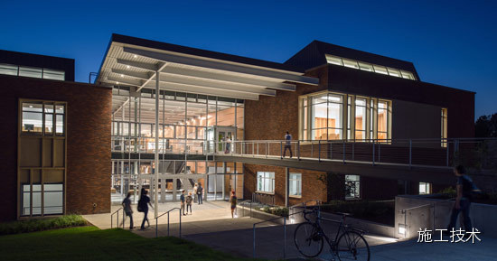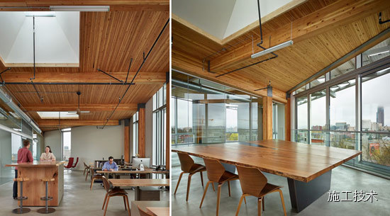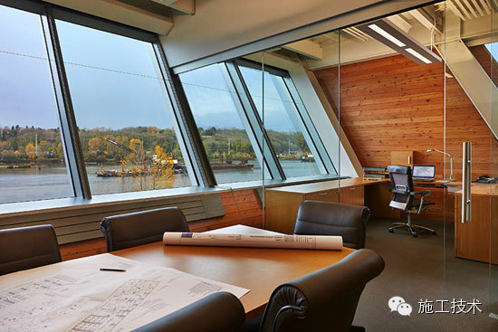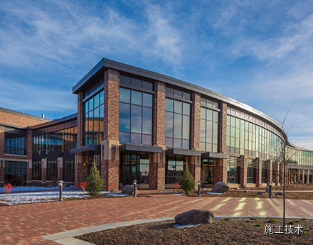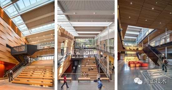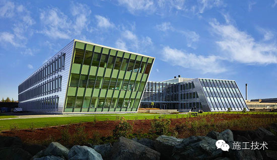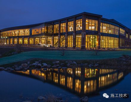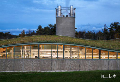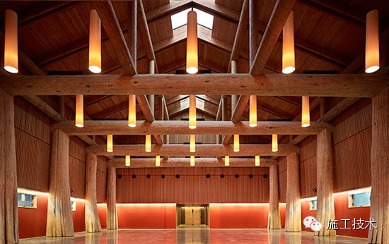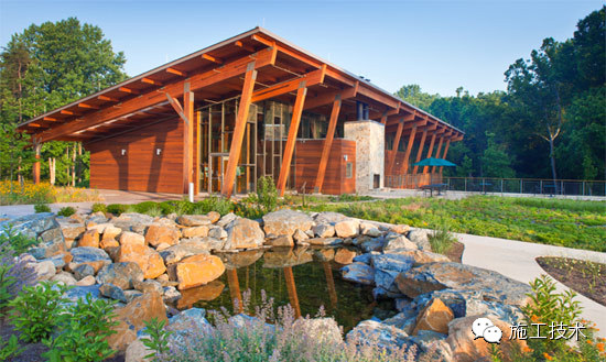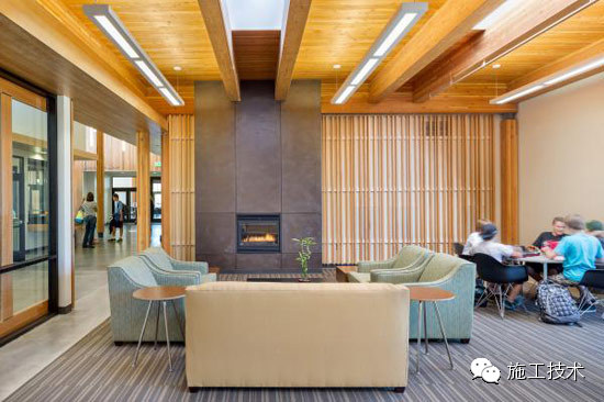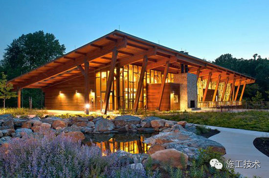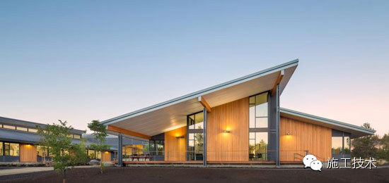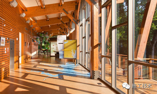建筑物的桁架為膠合層壓板,從而優(yōu)化了這種可再生資源的結(jié)構(gòu)價值。膠合板消耗能源少于鋼筋混凝土或鋼材,可用于更長的時間跨度,可承受重負(fù)荷,并且擁有復(fù)雜 的形狀。該建筑通過了LEED環(huán)境保護認(rèn)證,包括一套可再生的膠合板結(jié)構(gòu)系、節(jié)水管道夾具、利用可回收的當(dāng)?shù)夭牧稀⑹覂?nèi)擁有豐富的自然光線以及高效的機械 系統(tǒng)、照明和外表皮。