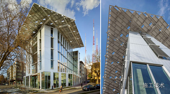 該建筑通過各種不同的系統(tǒng)達到以下這些目標(biāo),如一個高性能的建筑圍護結(jié)構(gòu);一個旨在優(yōu)化自然光的布局,估計有82%的中心空間將利用自然光采光。仔細(xì)與租戶 協(xié)調(diào),通過使用高效率的顯示器、復(fù)印機、筆記本電腦、零客戶端和基于云的服務(wù)器,以減少他們約75%的“插頭負(fù)載”。26孔、400英尺深的地源熱泵空調(diào) 系統(tǒng),將從地球收獲的能源來提供高效的加熱和冷卻,地板輻射系統(tǒng)將有效地加熱和冷卻辦公空間。242千瓦的屋頂太陽能光伏陣列將提供建設(shè)所需的所有凈能量。