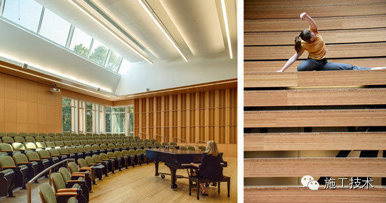 波特蘭里德學(xué)院表演藝術(shù)大樓建筑特色:里面有一個200座的劇院和靈活的座位配置,一個100座的非正式的黑盒劇場,100座的合唱排練廳和100座劇院性 能實驗室。教學(xué)和排練空間包括:多媒體實驗室和資源庫、兩大彩排舞蹈的劇院、服裝設(shè)計工作室,共享的教室和教師辦公室。