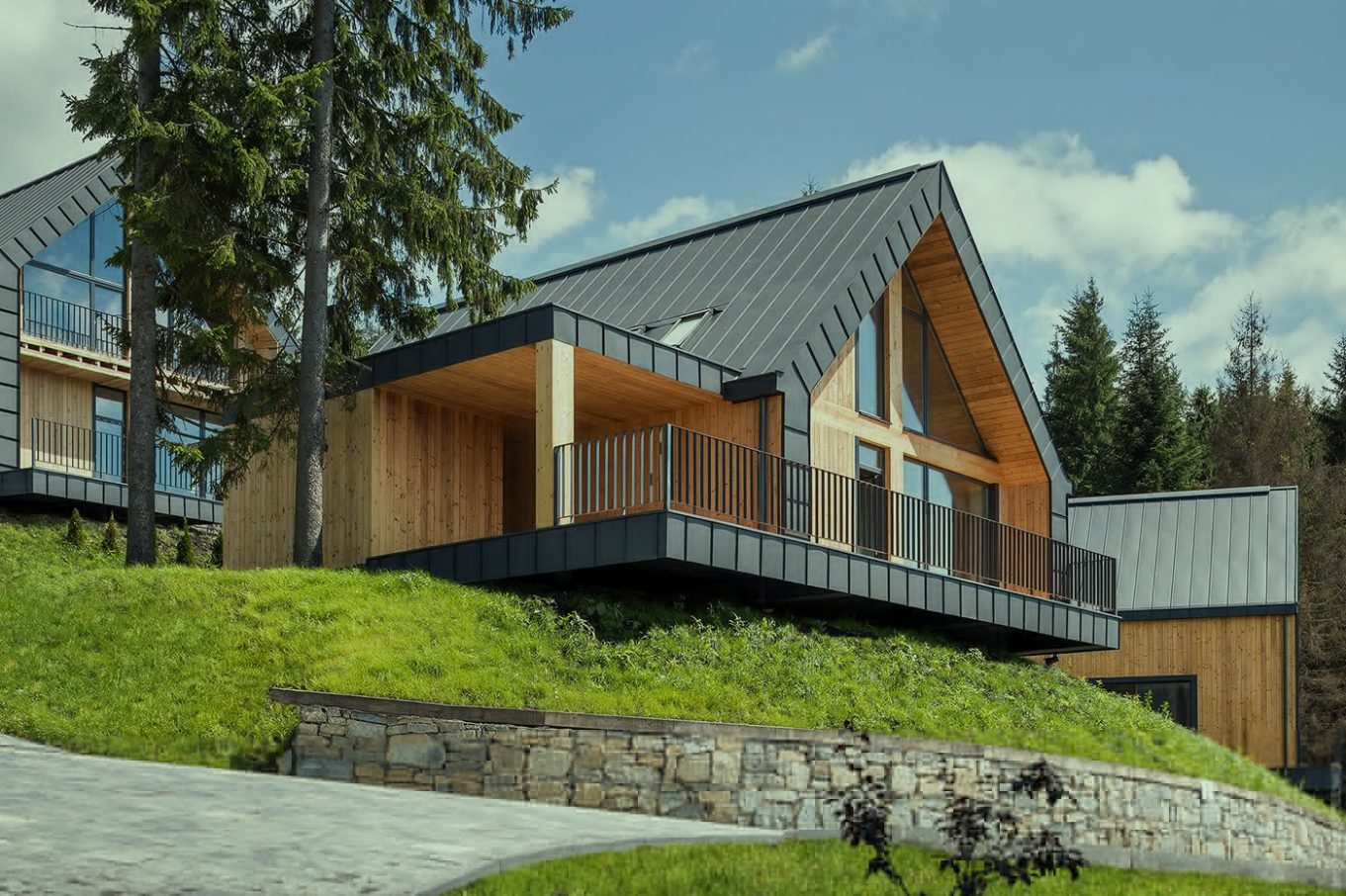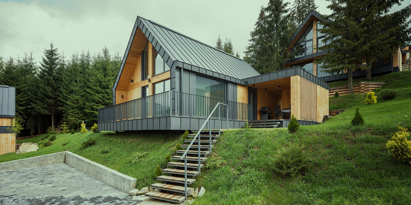 大面積窗戶:在木屋的設(shè)計中,采用大面積的窗戶設(shè)計,將周圍的自然美景引入室內(nèi)。這不僅可以讓居住者隨時欣賞到美景,還能增加室內(nèi)的采光和通風效果。