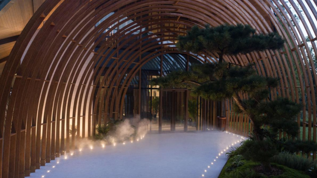 曲面屋頂聯(lián)系起整個建筑群落,豎向的桿件結(jié)合曲面屋面,組成自由、輕盈的建筑形態(tài),取材延續(xù)中國古建筑的質(zhì)樸自然,借助青瓦、鋼木等,打造建筑的原始與本真,釋放出閑適愜意的空間氛圍。