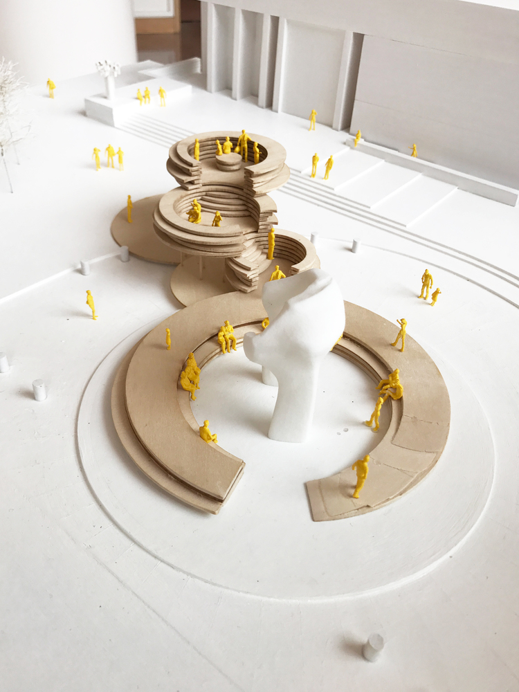 通過跨越現(xiàn)在已經(jīng)不復(fù)存在的旋轉(zhuǎn)狀態(tài),占領(lǐng)現(xiàn)在是一片空白的廣場區(qū)域,該設(shè)施的宗旨在于恢復(fù)場地的空間功能,鼓勵雕塑周圍的動態(tài)流通,并使人們以新的方式從水平和垂直兩個方向體驗這個廣場。